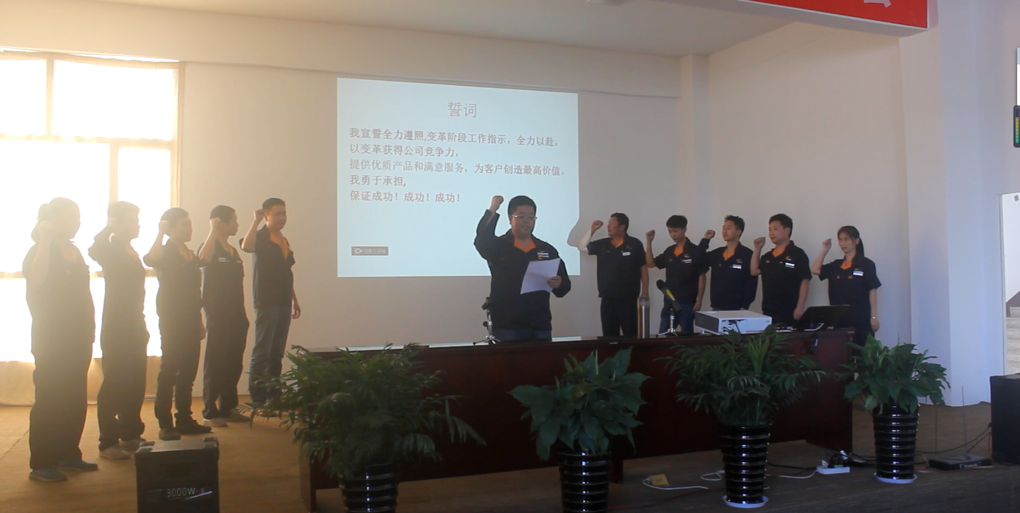 我宣誓全力遵照,变革阶段工作指示,全力以赴,以变革获得公司竞争力,提供优质产品和满意服务,为客户创造最高价值,我勇于承担,保证成功!成功!成功!