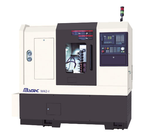 M42-I多功能车铣复合式数控车床,集成了车、铣、钻、镗、攻丝等功能与一台设备上,能进行端面和侧面的铣削、钻削、攻丝等复合加工,特别适合一些形状复杂、精度要求高的回转体零件的加工,可在一次装夹中完成全部或大部分工序的加工,即可保证精度、又可提高效率、降低成本。机床设计有灵活的主轴抱紧辅助机构,提高了零件加工时的刚性。直接式换刀系统,节省换刀程序的复杂步骤及缩短换刀空跑时间,做到了高效加工为用户节省成本。