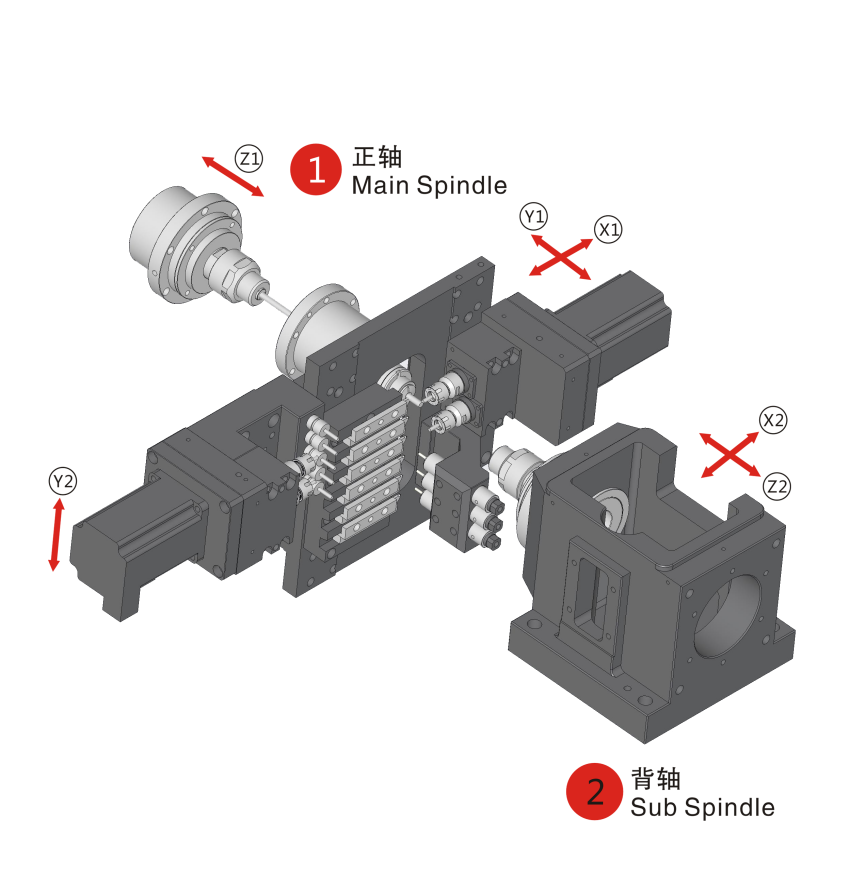 ●背面刀台配备Y轴,可复合加工实现背面侧和主轴侧的完全同时加工。