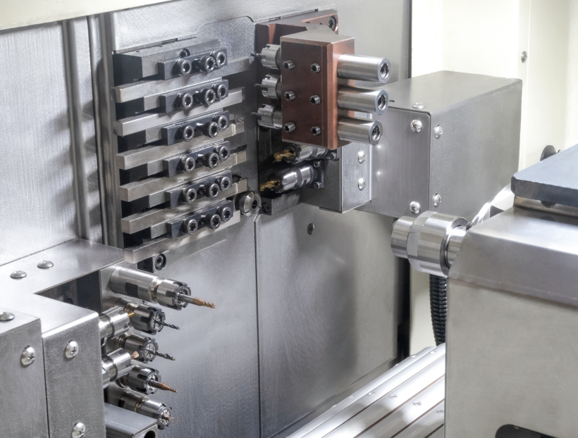 ●主轴部分配置6把方刀、侧面2把动力头可上下左右移动、端面3把钻孔刀具。